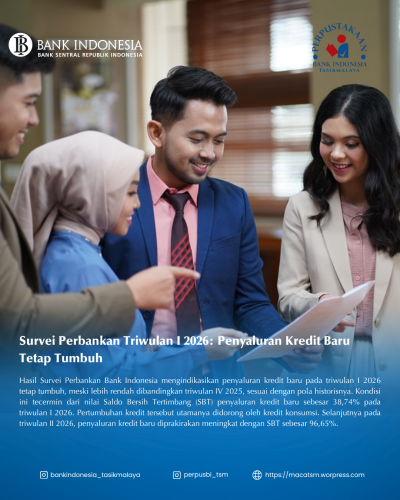 Hasil Survei Perbankan menunjukkan penyaluran kredit baru pada Triwulan I 2026 tetap tumbuh. Hal ini mencerminkan optimisme sektor perbankan serta dukungan pembiayaan terhadap aktivitas ekonomi.