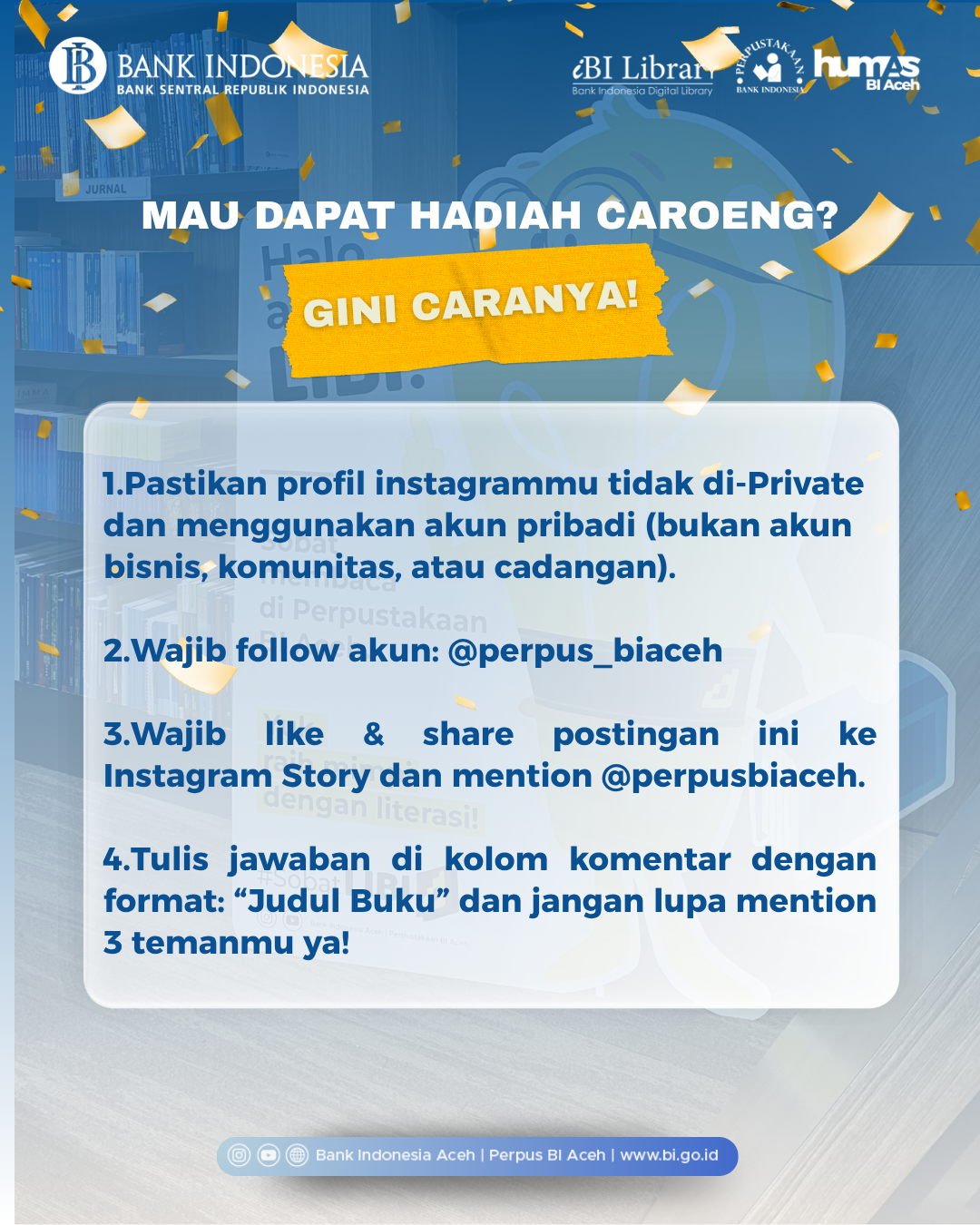 CAROENG merupakan program literasi kreatif Perpustakaan Bank Indonesia Aceh yang dirancang sebagai tantangan ringan dan edukatif untuk memanfaatkan perpustakaan secara aktif. Program ini dilaksanakan setiap Rabu pagi (Wednesday Morning) sebagai upaya membangun kebiasaan membaca, berpikir kritis, dan berinteraksi dengan koleksi perpustakaan di sela aktivitas kerja.