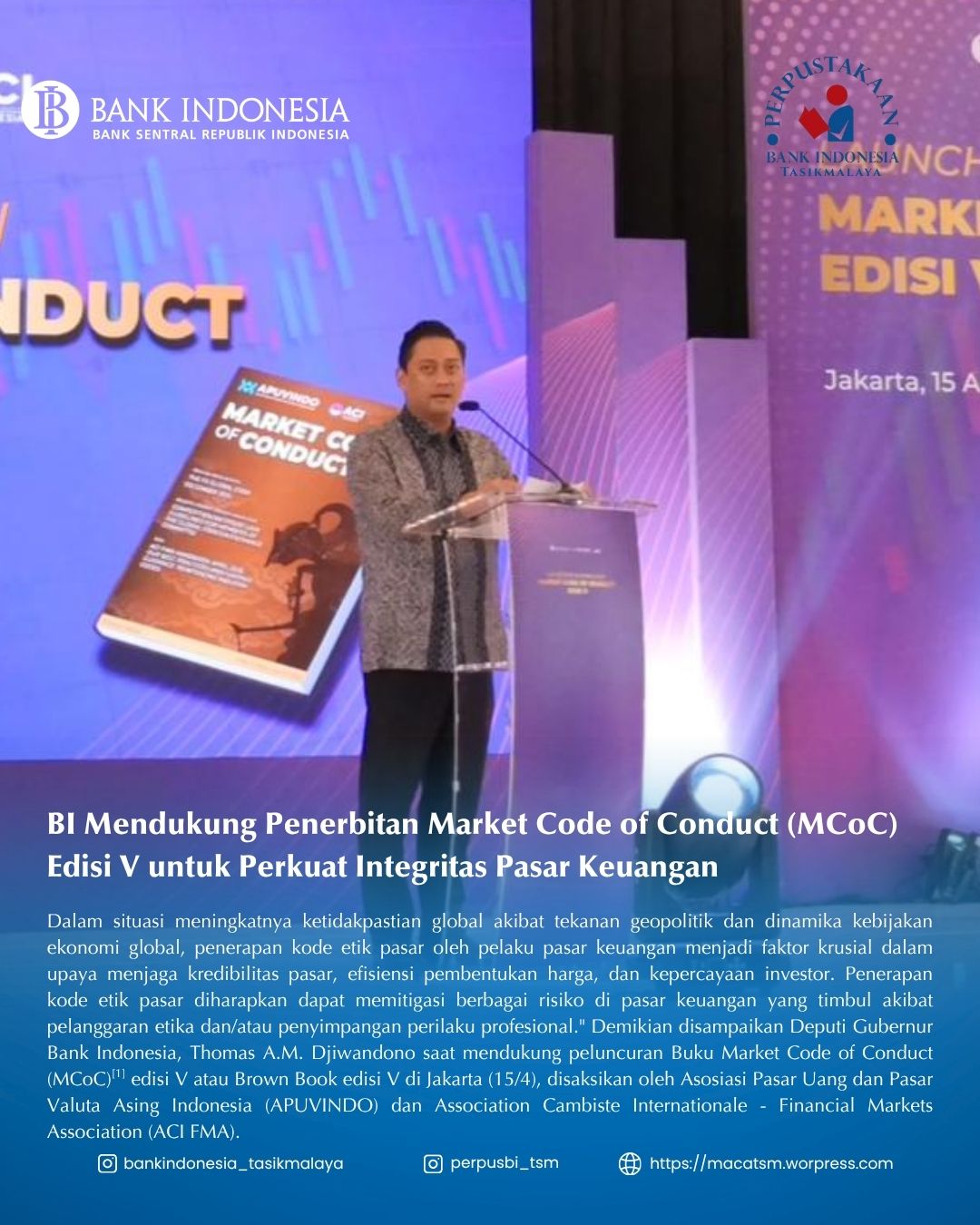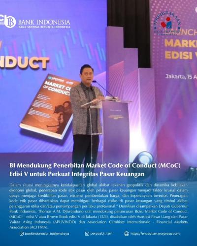 Bank Indonesia mendukung penerbitan MCoC edisi V sebagai pedoman kode etik bagi pelaku pasar keuangan guna memperkuat integritas, transparansi, dan kepercayaan investor. Standar ini juga membantu memitigasi risiko di tengah ketidakpastian global.