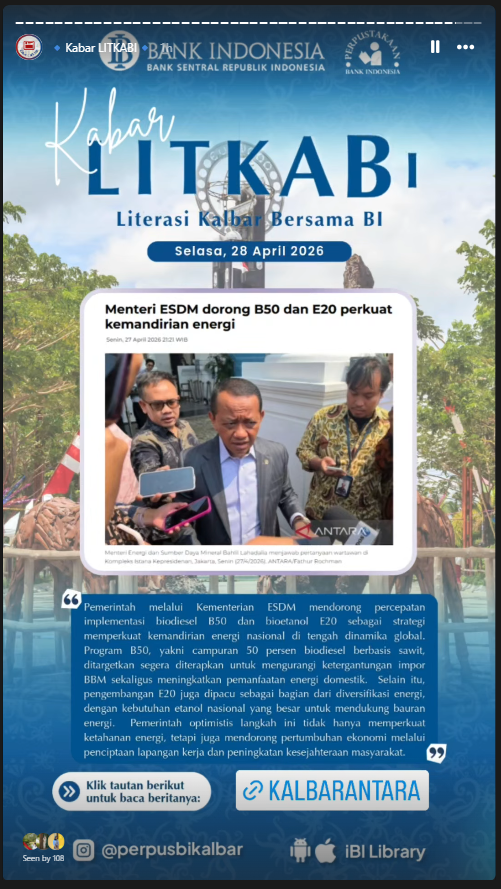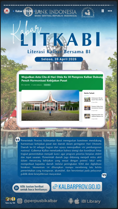 Yuk, simak Kabar Litkabi di Instagram Story Perpustakaan BI Kalbar Setiap Harinya, ruang literasi digital Kalimantan Barat bersama Bank Indonesia.